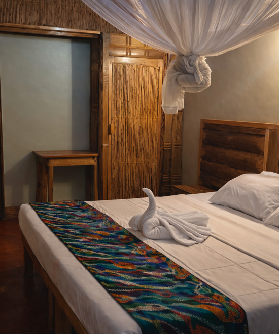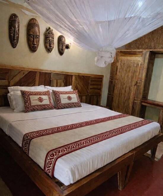 The Double Room is a spacious accommodation ideal for couples or small families. The room features a private bathroom equipped with a shower and complimentary toiletries. Guests can enjoy both a balcony and terrace while relaxing in the peaceful environment of the lodge. The room also includes a desk and wardrobe for added comfort during longer stays.